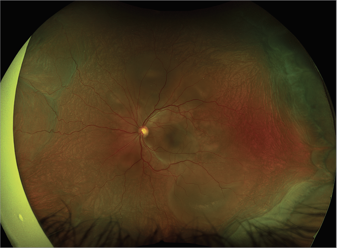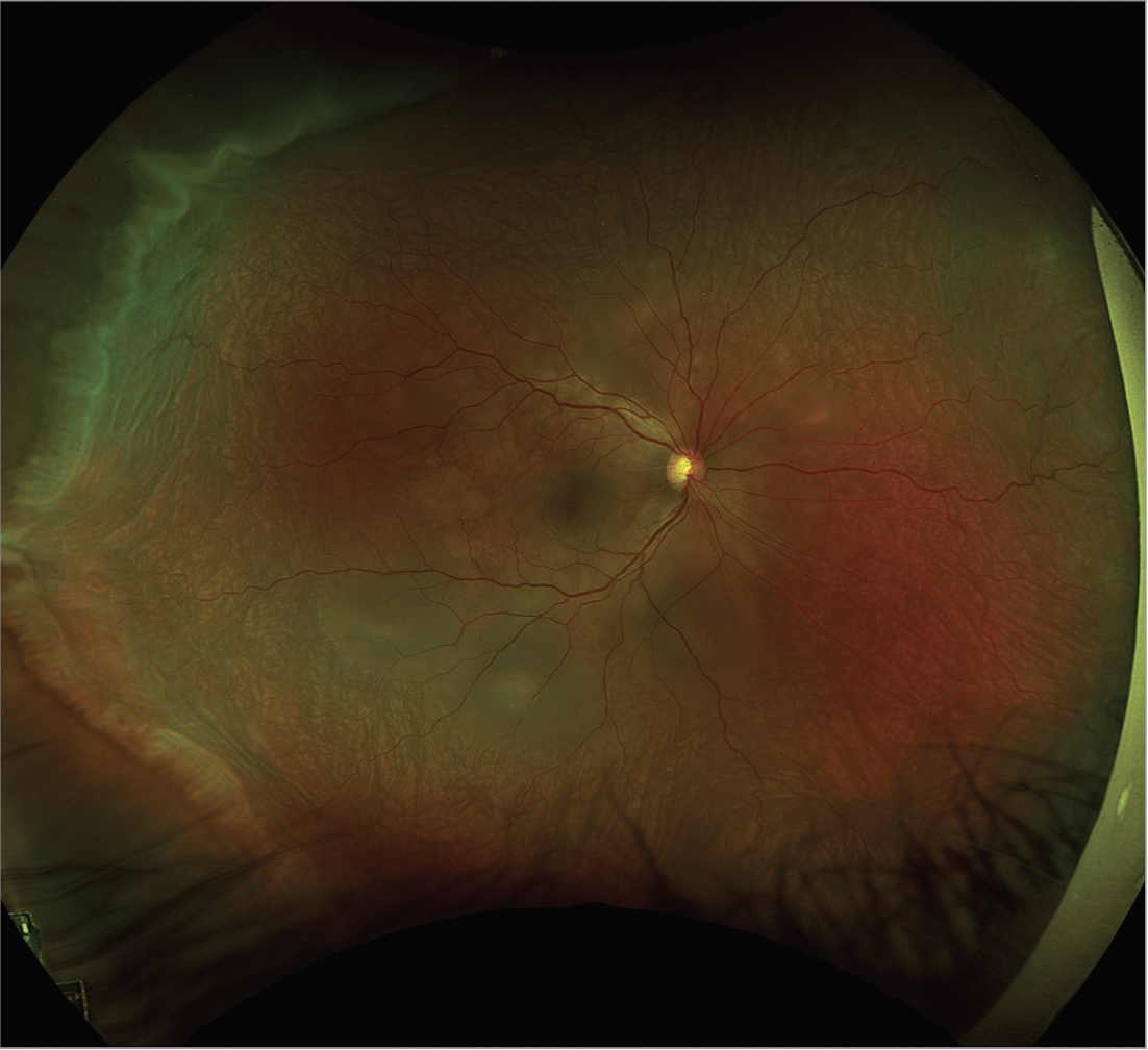 | Figure 1. Pseudo color fundus photo of the right eye with 360 degrees of serous choroidal detachments, bacillary detachments, and exudative subretinal fluid. |