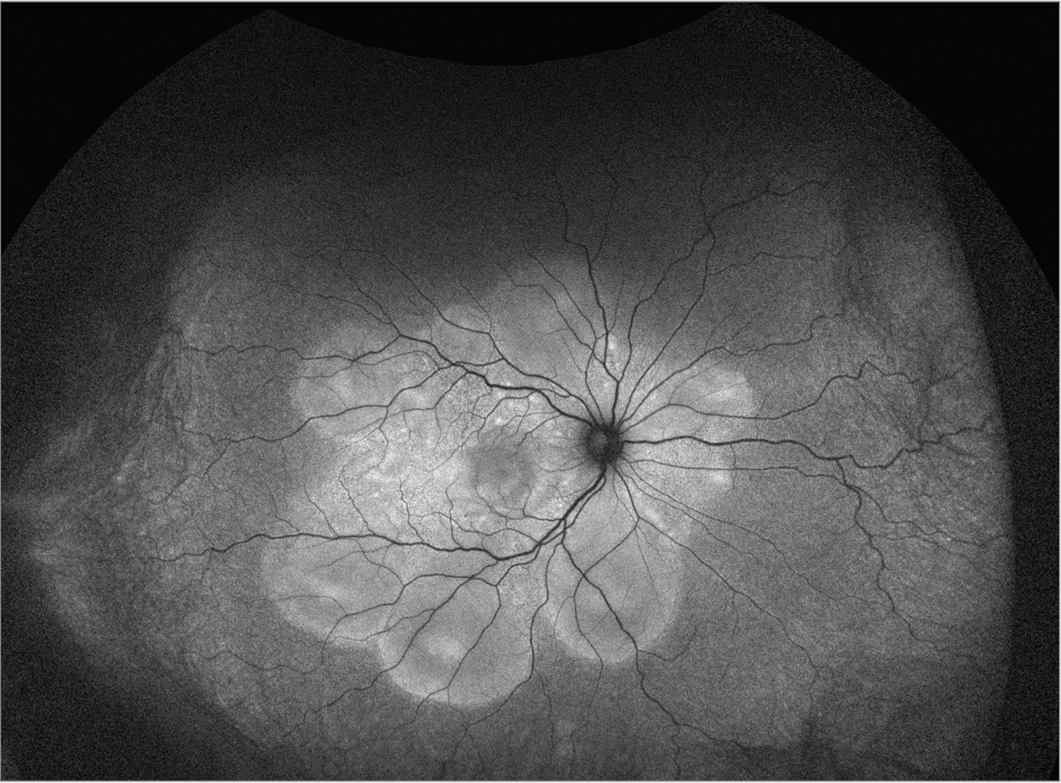 | Figure 3. Fundus autofluorescence of the right eye demonstrating hyper autofluorescence corresponding to pockets of subretinal fluid and bacillary detachments, degrees of serous choroidal detachments, bacillary detachments and exudative subretinal fluid. |
