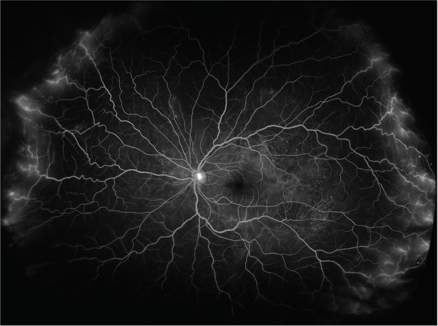 | Figure 4. Fluorescein angiogram of the left eye revealing diffuse leakage of peripheral vessels and “starry sky” appearance of the temporal midperiphery. |