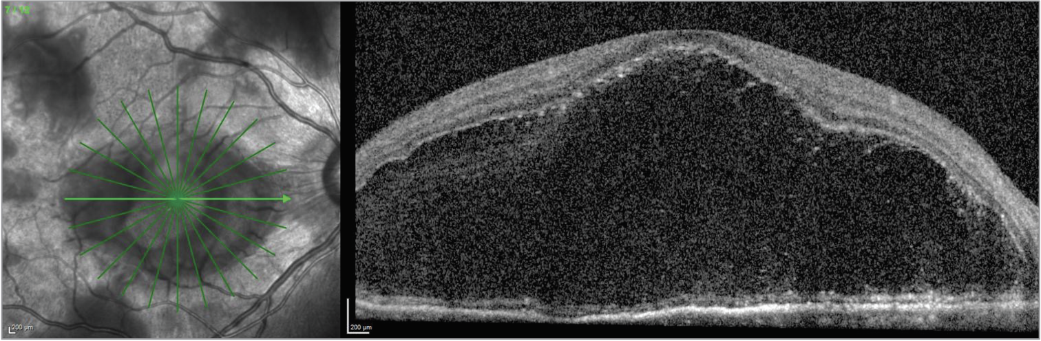 | Figure 6. OCT of the left eye revealing mixed subretinal fluid and bacillary detachments. |