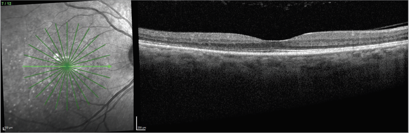 | CaptionFigure 7. OCT of the right eye one year after stopping infliximab. |