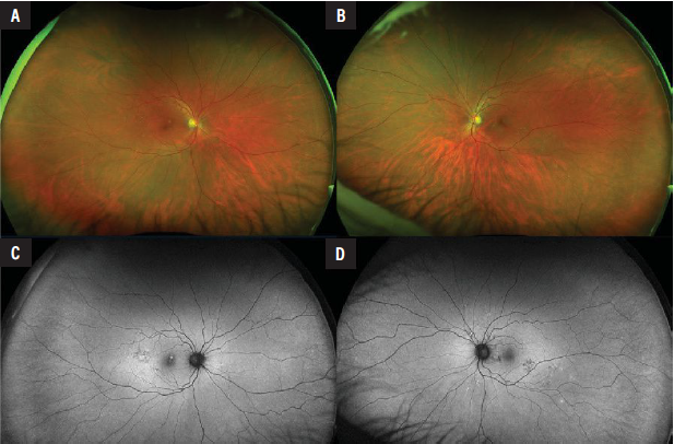 | Figure 1. Optos pseudocolor fundus photography of the right and left eyes demonstrating drusen around the central and temporal macula, and throughout the periphery (A, B). Vessels appear mildly attenuated. Fundus autofluorescence of the right and left eyes demonstrating hyper- and hypoautofluorescent changes throughout the macula and mid-periphery (C, D). |