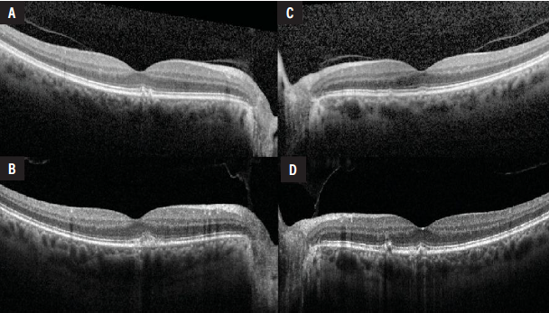 Fundus autofluorescence demonstrated hyper- and hypoautofluorescent changes throughout the posterior pole and mid-periphery (Figure 1C and 1D). Optical coherence tomography was notable for scattered sub-RPE deposits in both eyes (Figure 2). On comparison with imaging obtained four years prior to presentation to our service, there was mild blunting of the foveal contour in the right eye and progression of the sub-RPE deposits in both eyes (Figure 2B and 2D). Neither eye developed cystoid macular edema, subretinal fluid or hemorrhage.