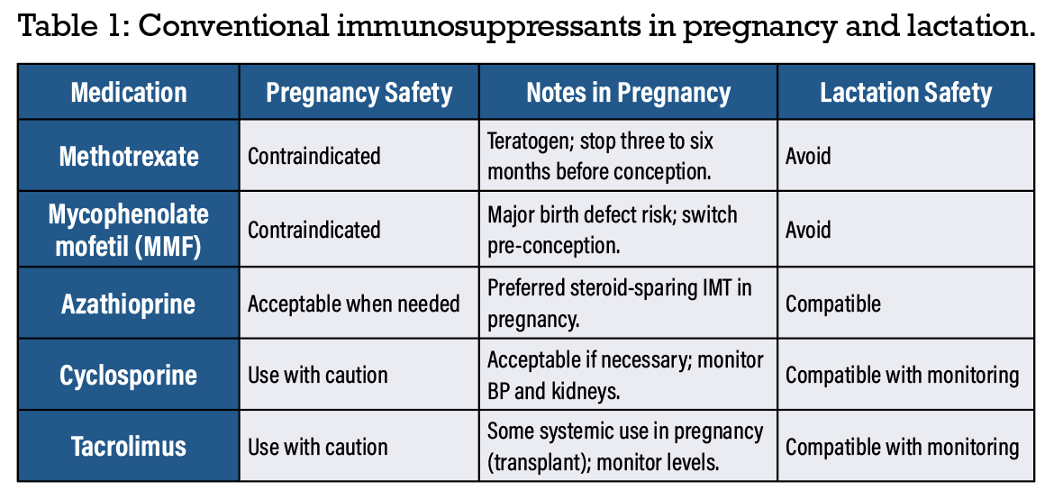 Azathioprine is widely considered one of the safest systemic immunosuppressants for use in pregnancy when required. While some studies associate it with low birth weight or preterm birth, these outcomes often reflect underlying disease severity rather than drug effect. For patients requiring systemic IMT, azathioprine is a strong first-line choice. Use and considerations of conventional immunosuppressives for uveitis in pregnancy is summarized in Table 1.1-8
