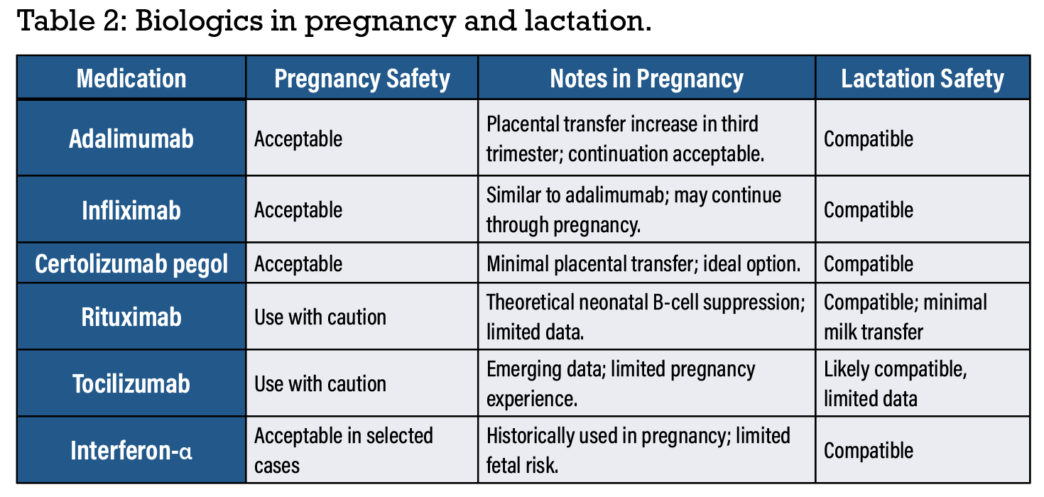 • TNF-α Inhibitors. Traditional practice has been to discontinue TNF inhibitors at the start of the third trimester due to placental transfer of IgG-based therapies. However, updated evidence suggests TNF inhibitors can be continued throughout pregnancy without increasing the infant’s risk of severe infections. Continuation may reduce postpartum flare and maintain better maternal disease control. Certolizumab is a uniquely attractive option during pregnancy because it lacks an Fc region, resulting in minimal placental transfer. It’s often preferred by patients concerned about fetal exposure5 and can replace other anti-TNF agents before conception if desired, although switching isn’t mandatory when disease control is excellent.