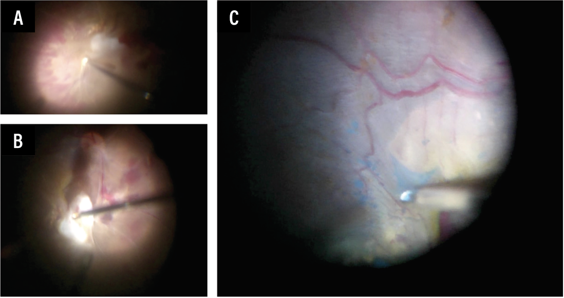 | Figure 1. A) Navigating tight surgical spaces with the 27-gauge vitrector to release fibrovascular traction and delamination further with proportion reflux hydro-dissection. B) Using end-gripping forceps to exert gentle tension on the membranes to release any underlying fibrovascular pegs. C) ILM peel is performed over the macula to relieve any residual traction. |