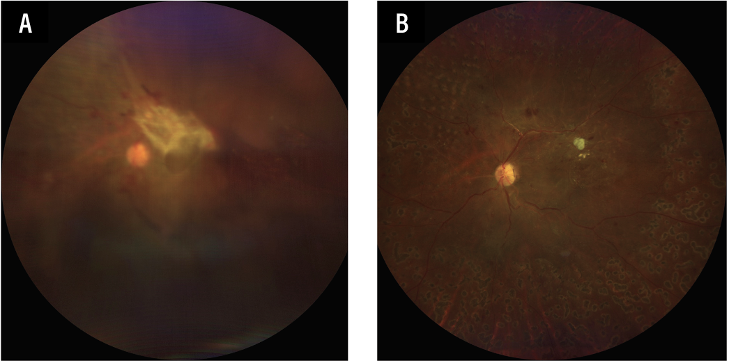 | Figure 2. A) Initial preoperative fundus photograph showing central dispersed vitreous hemorrhage, with “wolf-jaw” configuration TRD. B) Postoperative fundus photograph showing reattached retina with isolated residual fibrovascular stump. |