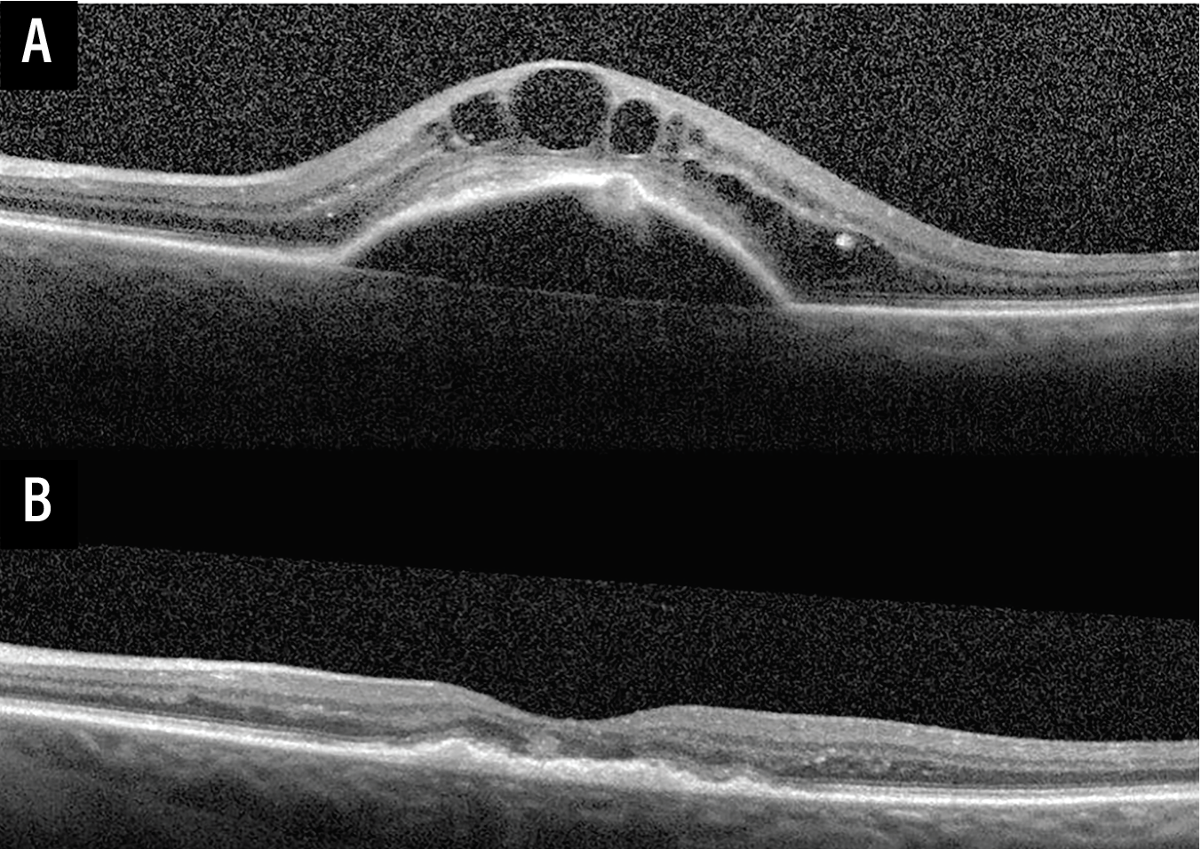 | Figure 1. Optical coherence tomography images demonstrating treatment response to intravitreal anti-VEGF therapy in treatment naive neovascular age-related macular degeneration. (A) Baseline OCT of the left eye at the time of presentation with neovascular AMD demonstrating a fibrovascular pigment epithelial detachment, subretinal hyperreflective material (SRHM), and intraretinal fluid. (B) Follow-up OCT of the same eye following three monthly loading intravitreal anti-VEGF injections demonstrating marked reduction in PED height and complete resolution of IRF—illustrating the robust anatomic response that supports a treat-until-dry management approach. |